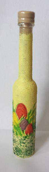 Eine kleine Aufmerksamkeit zu Ostern ist immer nett und so hab ich ein kleine Likörflasche dekoriert. Später kam noch eine grüne Schleife dran.